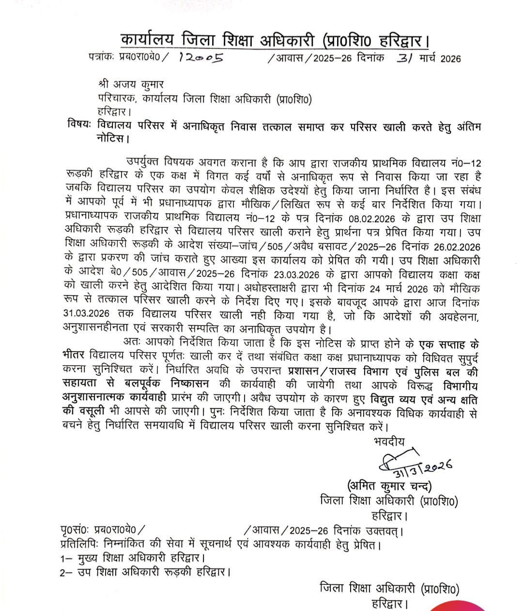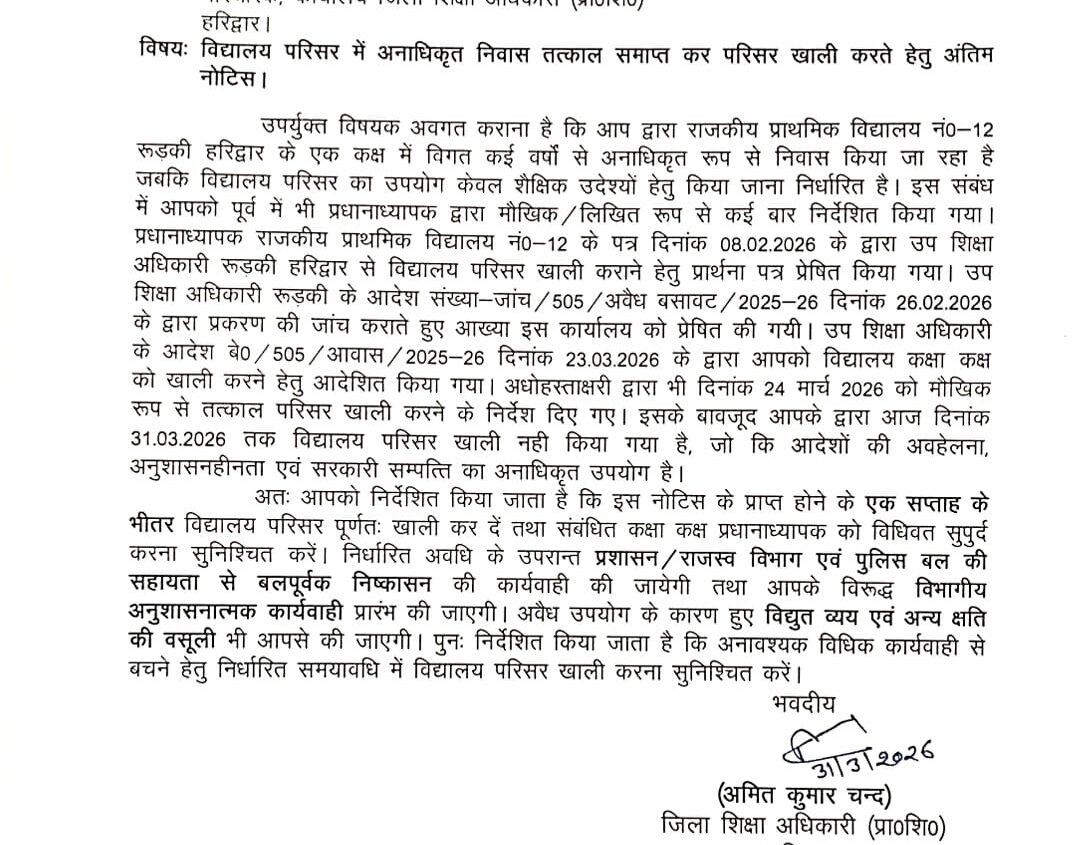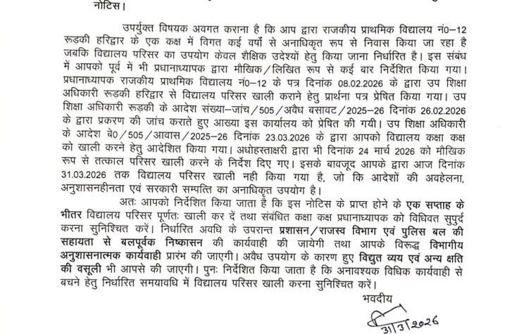 आरिफ नियाज़ी रूड़की राजकीय प्राथमिक विद्यालयों की संपत्ति पर अवैध कब्जों के खिलाफ शिक्षा विभाग ने अब सख्त रुख अख्तियार कर लिया है। राजकीय प्राथमिक...