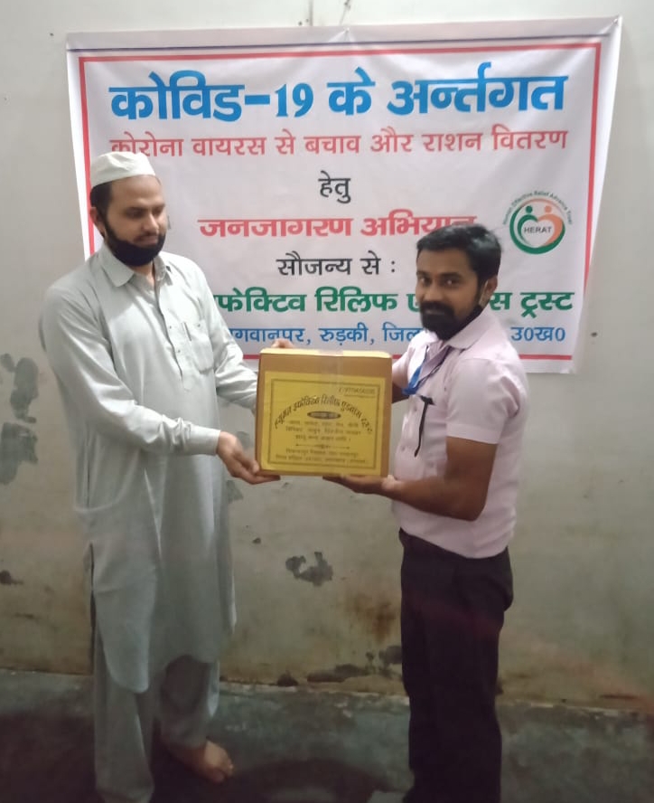 आज दिनांक 19मई 2021को ह्युमन इफैक्टिव रिलीफ एडवांस ट्रस्ट सिकन्दरपुर भैन्सवाल, भगवानपुर द्वारा विधवा महिलाओं गरीब बेसहारा लोगों और बच्चो को तलाश कर मिशन ‘कोई ना रहे भुखा’ के तहत उन तक लगातार पिछले एक महीने से राशन पहुंचा रहा है। आज ट्रस्ट को नारसन ब्लॉक से एक विकलांग मजबूर व्यक्ति की सूचना एक पत्रकार के माध्यम से मिली। पत्रकार ने बताया कि एक विकलांग मजबूर व्यक्ति हैं जो पिछले कई दिनों से अपने परिवार के साथ भुखा रह रहा है। सूचना मिलते ही ट्रस्ट के फ़ाउन्डर एम.अ. साबरी आनन फानन में अपनी टीम को लेकर उनकी मदद करने के लिए निकल पड़े जब लाभार्थी से बातचीत हुई तो पता चला कि वह व्यक्ति खुद भी विकलांग है एवं उसकी पत्नी भी विकलांग है और अभी चन्द दिन पहले ही उसके घर में बच्चे का जन्म भी हुआ है। व्यक्ति ने स्वयं बताया कि पिछले एक सप्ताह से राशन ना होने की वजह से हम काफ़ी परेशान हो चुके है बीच में ऐसा समय भी आया कि हम रात में भूखे ही सो गए और दुध ना होने की वजह से छोटा बच्चा रात में कईं बार बिलबिलाया। विकलांग व्यक्ति अपने घर का गुज़ारा एक छोटी सी फास्टफूड की रेडी लगाकर चलाता धा लेकिन प्रदेश में कोविड़ कृफ्यू होने की वजह से उसकी रेडी बन्द है।