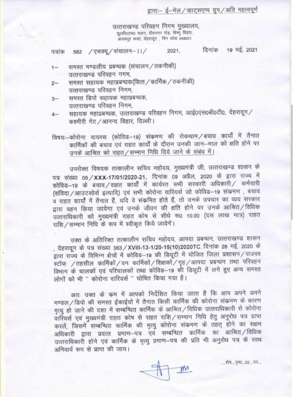 देहरादून। उत्तराखंड परिवहन निगम के कर्मचारियों काफी समय से मांग कर रहे थे कि कोरोना ड्यूटी में लगे चालक और परिचालकों को कोरोना वारियर्स घोषित किया है। 19 मई को जो आदेश जारी किया गया है, उसमें लिखा गया है कि बीते 9 अप्रैल को जारी किए गए आदेशनुसार कोविड-19 के राहत कार्यों में कार्यरत सभी सरकारी अधिकारी और कर्मचारियों के साथ कोरोना वॉरियर्स यदि संक्रमित होते हैं, तो उनके उनके उपचार का व्यय सरकार वहन करेंगी. उनके जीवन की क्षति होने पर उनके आश्रितों को मुख्यमंत्री राहत कोष से सीधे दस लाख रुपये राहत सम्मान निधि के रूप में स्वीकृत जिए जाएंगे। ऐसे में अब परिवहन निगम के चालकों और परिचालकों को कोरोना वॉरियर्स घोषित कर दिया गया है, लिहाजा कोविड-19 की ड्यूटी में लगे हुए इन कर्मचारियों को कोरोना वॉरियर्स का लाभ दिया जाएगा। इसके लिए अनुरोध पत्र एवं संबंधित प्रमाण पत्र की प्रति संबंधित मण्डलीय कार्यालय के माध्यम से अनुरोध के साथ यह प्रमाणित करते हुए संबंधित जिलाधिकारी को प्रेषित किया जाएगा। जिसमें संबंधित व्यक्ति कि निगम कार्मिक मण्डल/ कार्यालय की सम्बन्धित ईकाई में तैनात था और सम्बन्धित कार्मिक के आश्रित/ विधिक उत्तराधिकारी को मुख्यमंत्री राहत कोष से राहत प्रदान करने का अनुरोध करेंगे। इसके साथ ही इस पत्र की प्रतिलिपि निगम मुख्यालय के कार्मिक अनुभाग को भी उपलब्ध कराई जाए. कोरोना संक्रमण के कारण मृत्यु हो जाने की दशा में सम्बन्धित कार्मिक को निगम स्तर से यदि कोई प्राथमिक आर्थिक सहायता के रूप में यदि कोई धनराशि दी गई हो, तो उससे भी निगम मुख्यालय को अवगत कराया जाए।