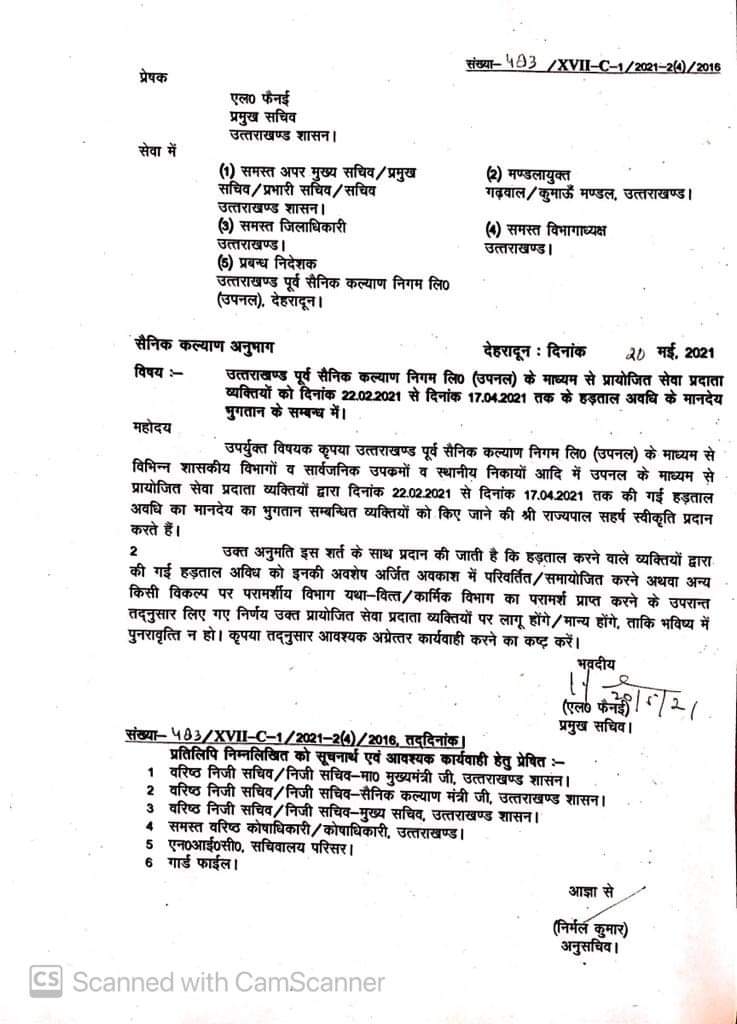 देहरादून– प्रदेश के उपनल कर्मचारियों के लिए आज की सबसे बड़ी खबर उत्तराखंड में पूर्व सैनिक कल्याण निगम लिमिटेड यानी उपनल के माध्यम से प्रायोजित सेवा प्रदाता व्यक्तियों को 22 फरवरी से 17 अप्रैल तक के हड़ताल अवधि के मानदेय भुगतान के संबंध में शासन ने आदेश जारी कर दिया है इसके तहत इन तमाम हड़ताली कर्मचारियों को हड़ताल अवधि के मानदेय का भी भुगतान किया जाएगा इसके लिए राज्यपाल ने मंजूरी दे दी है यह अनुमति इस शर्त के साथ दी जाती है कि हड़ताल करने वाले व्यक्तियों द्वारा की गई हड़ताल अवधि को इनकी अवशेष अर्जित अवकाश में परिवर्तित समायोजित करने अथवा अन्य किसी विकल्प पर परामर्श या विभाग का परामर्श प्राप्त करने के उपरांत लिया जाएगा प्रमुख सचिव ने आदेश किये जारी