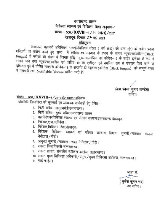 Jan Mudde 5 years ago 1 min read Spread the loveदेहरादून- उत्तराखंड से आज की बड़ी खबर सरकार ने पूरे प्रदेश में ब्लैक फंगस को महामारी घोषित किया प्रदेश में लगातार बढ़ते मामलों को देखते हुए इसको लेकर सरकार ने लिया फैसला स्वास्थ सचिव पंकज कुमार पांडे ने इसको लेकर आदेश जारी कर दिए हैं देखिए आदेश Continue Reading Previous लंढोरा के चमन् लाल डिग्री कॉलेज में लगा कोरोना टेस्ट कैम्प, पचास से अधिक लोगों ने कराई कोविड जांचNext अब इस फैसले से चर्चा में सी एम् तीरथ, समीक्षा बैठक में दिए बड़े निर्देश Leave a Reply Cancel replyYour email address will not be published. Required fields are marked *Comment * Name * Email * Website Save my name, email, and website in this browser for the next time I comment. More Stories उत्तराखंड 1 min read हरिद्वार जिले में गौकशी की बढ़ती घटनाओं से महामंडलेश्वर स्वामी यतीन्द्रानन्द गिरि महाराज बेहद नाराज़, पुलिस प्रशासन को ठहराया जिम्मेदार 1 year ago Jan Mudde उत्तराखंड 1 min read कांग्रेस नेता सचिन गुप्ता ने अपने पिता की तीसरी पुण्यतिथि पर लगाया रक्तदान शिविर, बड़ी संख्या में पहुंचे लोग 1 year ago Jan Mudde उत्तराखंड 1 min read रुड़की में बाइक सवार युवक पर ताबड़तोड़ फायरिंग,हालत गंभीर,पुरानी रंजिश का मामला 1 year ago Jan Mudde