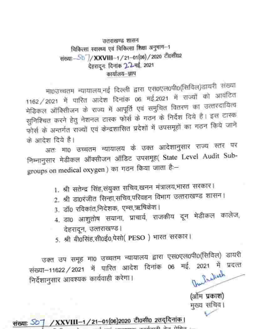 देहरादून– उत्तराखंड राज्य सरकार ने उच्चतम न्यायालय के आदेशानुसार मेडिकल ऑक्सीजन ऑडिट उप समूह का किया गठन जिसमें सत्येंद्र सिंह संयुक्त सचिव खनन मंत्रालय भारत सरकार रंजीत सिन्हा सचिव परिवहन उत्तराखंड रवि कांत निदेशक ऐम्स आशुतोष सयाना राजकीय दून मेडिकल कॉलेज और बी सिंह सी ई भारत सरकार को टीम में दी गई जगह उत्तम न्यायालय नई दिल्ली द्वारा राज्यों को आवंटित मेडिकल ऑक्सीजन के राज्य में आपूर्ति व समुचित वितरण का उत्तरदायित्व सुनिश्चित करने के लिए नेशनल टास्क फोर्स के गठन के निर्देश दिए हैं स्टार फोर्स के अंतर्गत राज्यों केंद्र शासित प्रदेशों में उप समूह का गठन किया जाना था जिसके आदेश आज मुख्य सचिव ओमप्रकाश ने कर दिए हैं