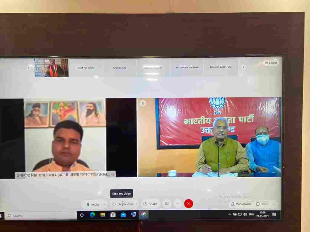 वर्चुअल माध्यम से बैठक में प्रदेश महामंत्री राजेन्द्र भंडारी, कुलदीप कुमार, सुरेश भट्ट , प्रदेश मीडिया प्रभारी मनवीर सिंह चौहान, शेखर वर्मा सभी जिलों अलग अलग रूप से जिलाध्यक्ष विधायक व सांसद मौजुद रहे। आज जिन पांच जनपदों की अलग अलग वर्चुअल बैठक ली गई उनमें उत्तरकाशी, चमोली, रुद्रप्रयाग, टिहरी , देहरादून ग्रामीण जिले शामिल रहे । बैठकों का दौर प्रातः 10 बजे से सायं 6 बजे तक जारी रहा । अन्य जिलों की बैठकें 24 व 25 मई को आयोजित की गई हैं।