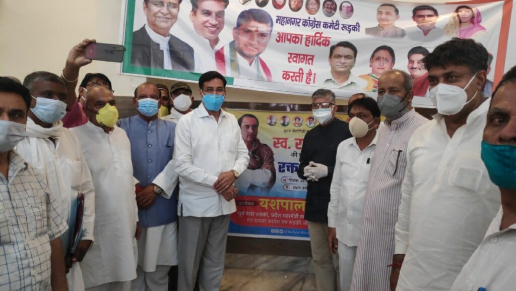 देश के पूर्व प्रधानमंत्री स्व राजीव गांधी की पुण्यतिथि के स्मरण में प्रदेश कांग्रेस कमेटी के आह्वान पर रूडकी के कांग्रेसी नेताओं ने भी साकेत स्थित हरमिलाप धर्मशाला में रक्तदान शिविर का आयोजन किया जिसमें लगभग 80 लोगों ने रक्तदान किया। इस दौरान शहर के युवाओं में भारी उत्साह देखने को मिला।इस मौके पर कांग्रेस प्रदेश अध्यक्ष प्रीतम सिंह ने कहा कि कोरोना काल मे इस समय देश बेहद नाजुक दौर से गुज़र रहा है ऐसे में लोगों को रक्त के लिए इधर उधर ना भटकना पड़े इसलिए कांग्रेस पार्टी पूरे प्रदेश में रक्तदान शिविर लगा रही है