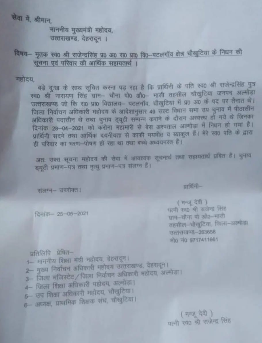 अल्मोड़ा। सल्ट उप चुनाव में पीठासीन अधिकारी के पद पर तैनात चौखुटिया के राजकीय प्राथमिक विद्यालय पटल गांव के शिक्षक राजेन्द्र सिंह की कोरोना संक्रमित होने के बाद मौत हो गई। परिवार के कुछ सदस्य भी संक्रमित हो गए। अब परिजनों ने मुख्यमंत्री को पत्र भेजकर परिवार की आर्थिक मदद किये जाने की मांग की है। मृतक शिक्षक की पत्नी मंजू देवी ने सीएम को भेजे पत्र में कहा कि उनके पति राजकीय प्राथमिक विद्यालय पटलगांव में अध्यापक के पद पर तैनात थे। सल्ट उप चुनाव में जिला निर्वाचन अधिकारी के आदेश के बाद पीठासीन अधिकारी के पद पर तैनात थे। वह ड्यूटी के दौरान बीमार हो गए। जिनका 28 अप्रैल 2021 को कोरोना महामारी से बेस अस्पताल में निधन हो गया। अब परिवार के लोगों ने मुख्यमंत्री से परिवार की आर्थिक मदद किये जाने की मांग की। उन्होंने कहा कि यूपी सरकार की तर्ज उनको भी उत्तराखंड सरकार आर्थिक मदद करें।उनके अनुसार उनकी आर्थिक स्थिति ठीक नहीं है और बच्चे पढ़ रहे हैं ऐसे में सरकार हमारी मदद करे ।