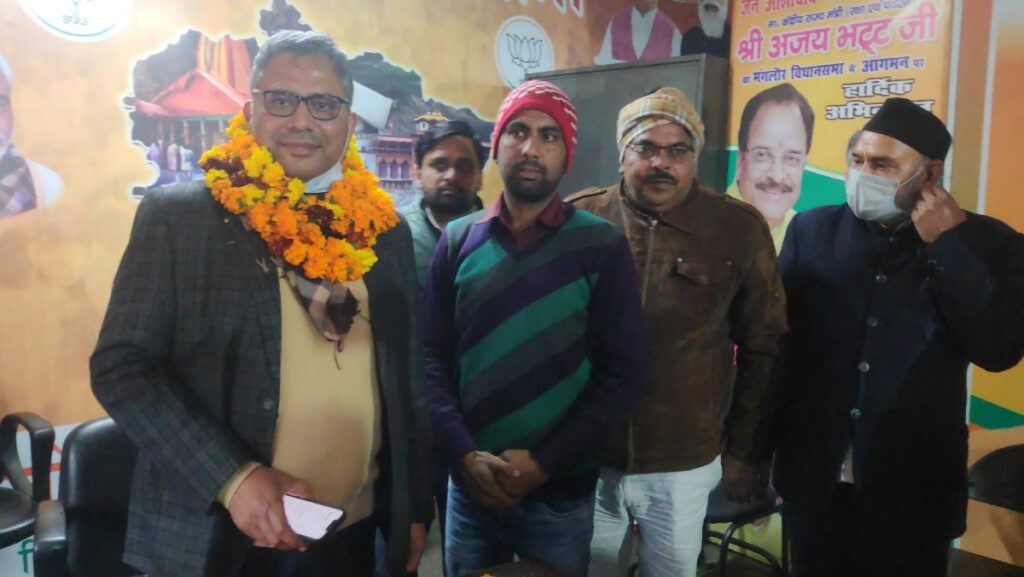 उत्तराखंड में भारतीय जनता पार्टी ने अपनी पहली सूची जारी करते हुए लगभग सभी विधानसभा के प्रत्याशियों की घोषणा कर दी है जिसमें मंगलोर विधानसभा से दिनेश सिंह पवार को भारतीय जनता पार्टी ने मौका दिया है ।आजमंगलौर विधानसभा से जैसे ही दिनेश सिंह पवार के नाम की घोषणा हुई तो उनके कार्यालय पर बीजेपी कार्यकर्ताओं ने फूल मालाओं से जोरदार स्वागत किया । इस दौरान भाजपा प्रत्याशी दिनेश सिंह पवार ने बड़ी बेबाकी के साथ कहा कि पार्टी हाईकमान ने इस बार उन्हें मौका दिया है जिसके लिए वह भाजपा हाईकमान का बेहद आभार व्यक्त करते है।