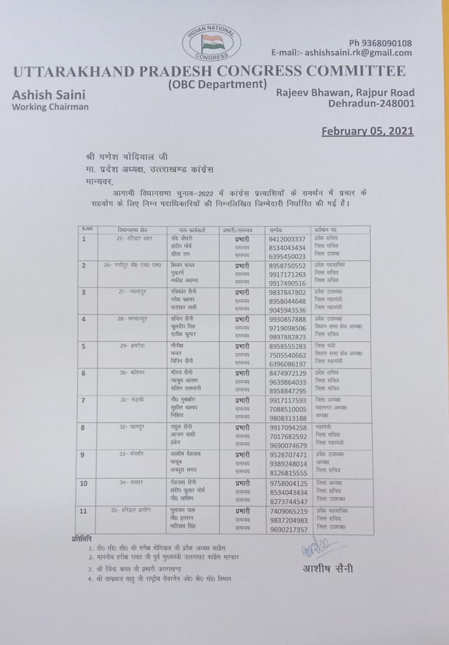 कांग्रेस ओबीसी प्रकोष्ठ के प्रदेश अध्यक्ष आशीष सैनी द्वारा विधानसभा चुनाव में पार्टी को मजबूत करने के लिए हरिद्वार से लेकर 11 विधानसभाओं में प्रकोष्ठ के प्रभारी नियुक्त किए हैं जो प्रभारी बनाए गए हैं वह कांग्रेस पिछड़ा वर्ग प्रकोष्ठ के सभी पदाधिकारी हैं जिनसे आशीष सैनी ने आशा व्यक्त की है कि पार्टी को मजबूत करने में और विधानसभाओं के प्रत्याशियों को जिताने में इन विधानसभा प्रभारियों की जिम्मेदारी अहम होगी ओबीसी पिछड़ा वर्ग प्रकोष्ठ के प्रदेश अध्यक्ष आशीष सैनी ने दावा किया है कि इस बार पूर्ण बहुमत के साथ कांग्रेस की सरकार बनेगी और कॉन्ग्रेस पूरी मजबूती के साथ उभरकर सामने आएगी।