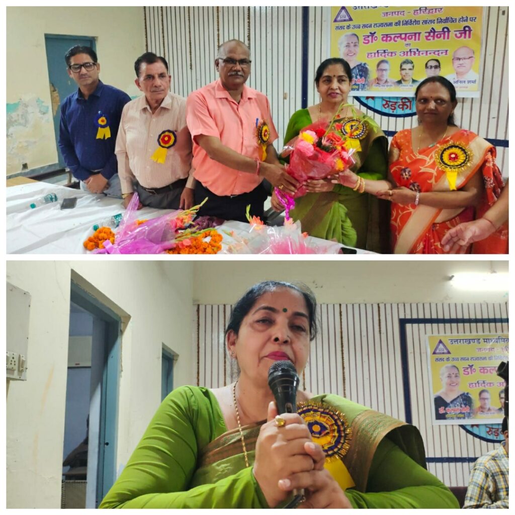 उत्तराखण्ड माध्यमिक शिक्षक संघ ने आर्य कन्या इण्टर कॉलेज में स्वागत समारोह का आयोजन किया गया। राज्यसभा सांसद डॉ० कल्पना सैनी के सम्मान में प्रान्तीय अध्यक्ष डॉ० अनिल शर्मा की अध्यक्षता एवं जिलाध्यक्ष राजेश सैनी के संचालन में सम्पन्न कार्यक्रम में जनपद हरिद्वार से अनेक शिक्षक- शिक्षिकाओं ने प्रतिभाग किया। राज्यसभा सांसद डॉ० कल्पना सैनी का शॉल ओढ़ाकर, स्मृति चिह्न एवं पुष्पगुच्छ भेंटकर तथा माल्यार्पण कर स्वागत किया गया।
