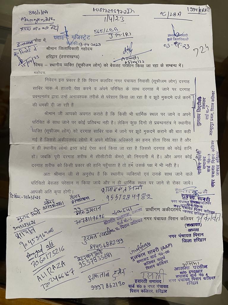 वहीं इस पत्र को भेजने वालों में नगर पंचायत चेयरमैन सखावत अली,सभासद गुलशाद सिद्दीकी,सभासद नाजिम त्यागी,सभासद शबनम साबरी,सभासद आसमां प्रवीन, हसरती,गुलफाम साबरी,आफताब हुसैन,अली राजा,अमजद अली,मेहरबान अली,हुरमत त्यागी, सभासद श्रीमती रुकय्या,शादाब,साजिद अली,मुराद अली,आदि ने जिलाधिकारी को भेजे शिकायती पत्र में कहा है की देश के किसी भी धार्मिक स्थल पर अकेले या अपने परिचित के साथ जाने में कोई प्रतिबंध नहीं है लेकिन कुछ समय से दरगाह प्रबंधन सुफिज्म को मानने वाले लोगों को झूठे मुकदमों में फंसाने की धमकी दी जा रही है जिससे दरगाह के मानने वाले लोगों में अपने अधिकारों का मौलिक हनन हो रहा है। सभी सभासदों ने जिलाधिकारी को शिकायत में कहा की उन्हें और उनके साथ जाने वाले लोगों को दरगाह में जाने से ना रोका जाए ।