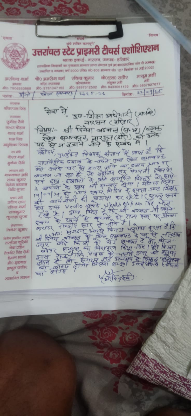 उत्तराखंड राज्य प्राथमिक शिक्षक संघ ने खेल समन्वयक दिनेश बड़वाल को ना हटाए जाने के लिए उप शिक्षा अधिकारी नारसन को ज्ञापन दिया है।प्राथमिक शिक्षक संगठन नारसन ने उप शिक्षा अधिकारी मैराज अहमद को दिये ज्ञापन में लिखा है की उनके संज्ञान में आया है कि राजनीतिक दबाव के चलते खेल समन्वयक नारसन दिनेश बड़थवाल को उनके पद से हटाए जाने का षड्यंत्र रचा जा रहा है जिसको संगठन कदापि बर्दाश्त नहीं करेगा। खेल समन्वयक दिनेश बड़वाल छात्र-छात्राओं के खेल के प्रति समर्पित शिक्षक हैं यदि उन्हें इस पद से राजनीतिक षड्यंत्र के तहत हटाया गया तो यह उनके साथ अन्याय होने के साथ-साथ छात्र छात्राओं के साथ भी अन्याय होगा क्योंकि उक्त शिक्षक दिनेश बड़वाल छात्र-छात्राओं को राज्य एवं राष्ट्रीय स्तर तक प्रतिभाग कराते हैं। विगत कई वर्षों से नारसन विकासखंड के बच्चे न केवल राज्य स्तर पर बल्कि राष्ट्रीय स्तर पर भी विकासखंड के साथ-साथ जनपद हरिद्वार का नाम भी रोशन कर रहे हैं संगठन ने चेतावनी दी कि यदि दिनेश बड़वाल को उनके पद से हटाया जाएगा तो संगठन आंदोलन के लिए बाध्य होगा इस अवसर पर संगठन के मंत्री मासूम अली कोषाध्यक्ष रविंद्र कुमार अध्यक्ष अरविंद शर्मा के साथ-साथ शरद शर्मा कन सिंह राठौड़ तसलीमा कुंतल गुप्ता जेब परवीन ज्योति गर्ग चंद्र सेन शर्मा धाम सिंह राजकुमार वीर सिंह पवार अब्दुल कादिर सफाकत अली राजेश सैनी परमिंदर मलिक आदि शिक्षकों ने शिक्षा अधिकारी को ज्ञापन दिया।