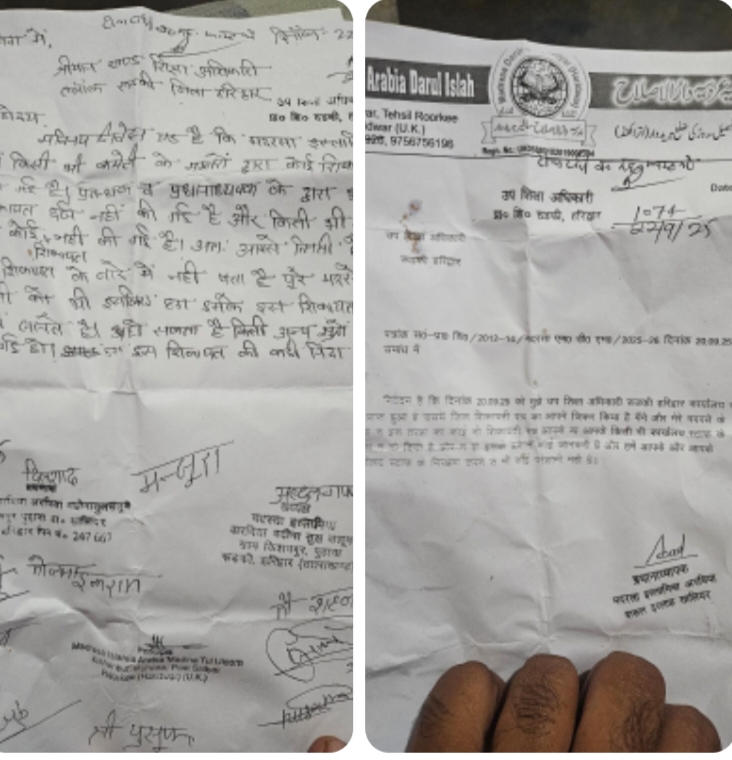 रूड़की खंड शिक्षा अधिकारी कार्यालय की शिकायत के मामले में नया मोड़ आ गया है हाल ही में दो अरबी मदरसों के संचालकों ने खंड शिक्षा अधिकारी को पत्र जारी कर कहा है की उनके द्वारा आपकी और आपके कार्यालय से कोई शिकायत नहीं की गई है हमें विभाग से कोई शिकायत नहीं है।