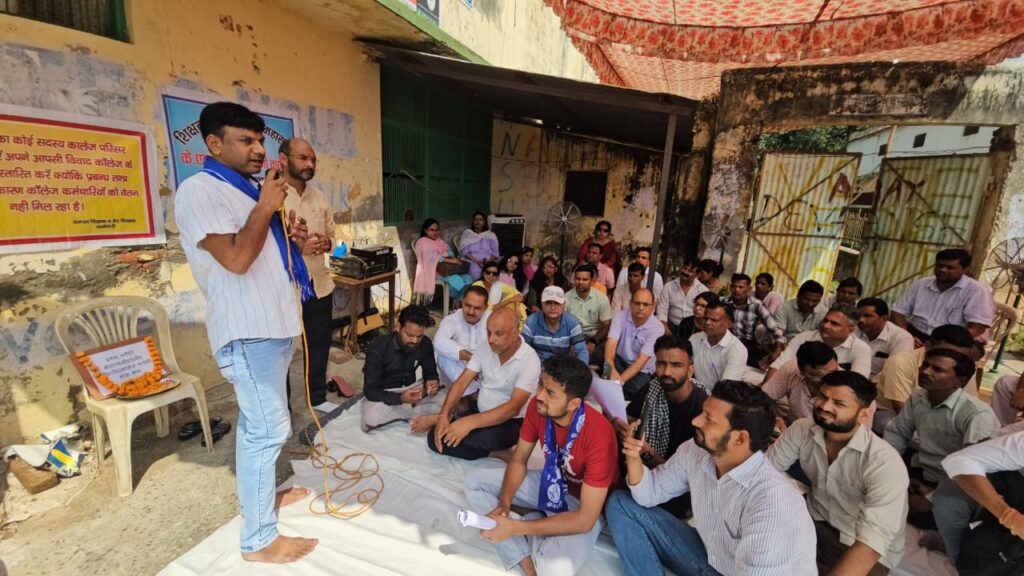 मुख्यमंत्री के आश्वासन के बाद भी शिक्षकों को उनका वेतन मिलता नज़र नहीं आ रहा है गुस्साए शिक्षकों ने कॉलेज प्रबंधन पर गंभीर आरोप लगाए हैं वहीं आज भीम आर्मी छात्र संघ से जुड़े कार्यकर्ताओं का भी कॉलेज के शिक्षकों को समर्थन मिला है भीम आर्मी