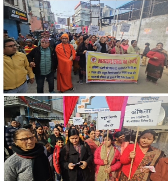 उत्तराखंड एकता मंच के आह्वान पर अंकिता हत्याकांड में दोषियों को कड़ी सजा दिलाने और मामले की निष्पक्ष सीबीआई जांच की मांग क़ो लेकर सुभाष नगर से जॉइंट मजिस्ट्रेट कार्यालय तक ज़ोरदार नारेबाज़ी के साथ रैली निकाली। सभी प्रदर्शनकारियों के हाथों में तख्तीयां थी जिनपर अंकिता के हत्यारों क़ो सजा दिलाये जाने की मांग लिखी थी।