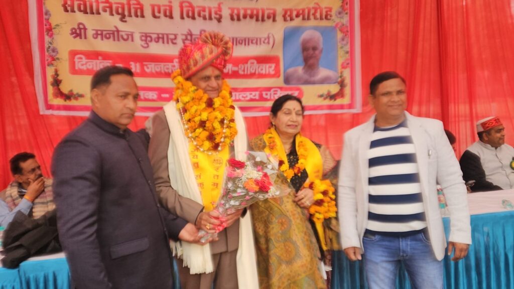 विदाई समारोह में मनोज सैनी को स्मृति चिन्ह, बुके और शॉल भेंट कर सम्मानित किया गया। उपस्थित सभी लोगों ने उनके स्वस्थ और सुखद भविष्य की कामना की। समारोह के अंत में माहौल भावुक हो गया जब शिक्षकों और कर्मचारियों ने उन्हें नम आंखों से विदाई दी।इस अवसर पर उत्तराखंड माध्यमिक शिक्षक संघ के प्रांतीय अध्यक्ष स्वतंत्र मिश्रा, महामंत्री डॉ महावीर बिष्ट, प्रांतीय संरक्षक डॉ अनित शर्मा, भोपाल सिंह सैनी,प्रांतीय उपाध्यक्ष प्रदीप त्यागी,अश्वनी शर्मा,