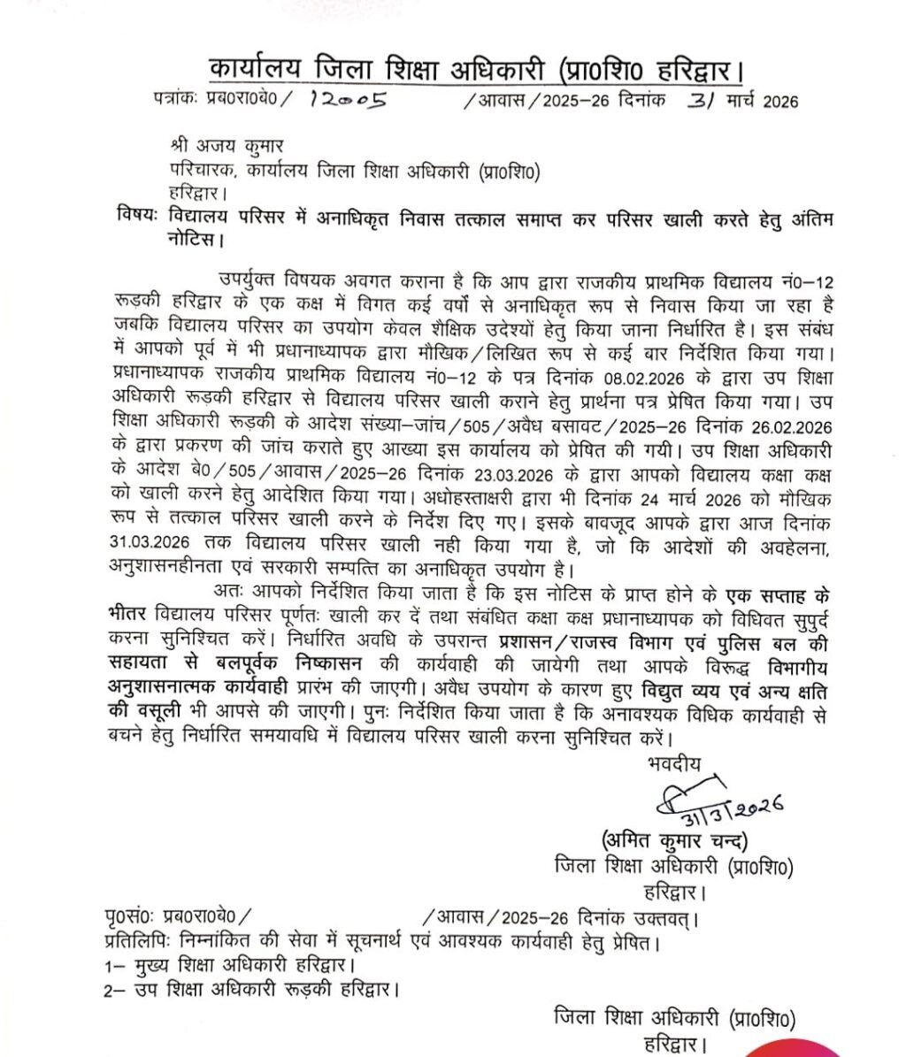 रूड़की राजकीय प्राथमिक विद्यालयों की संपत्ति पर अवैध कब्जों के खिलाफ शिक्षा विभाग ने अब सख्त रुख अख्तियार कर लिया है। राजकीय प्राथमिक विद्यालय संख्या-12, रुड़की में पिछले कई वर्षों से एक कक्षा-कक्ष पर जमाए गए अनधिकृत कब्ज़े को खाली कराने के लिए जिला शिक्षा अधिकारी (प्राथमिक शिक्षा) ने अंतिम नोटिस जारी कर दिया है।